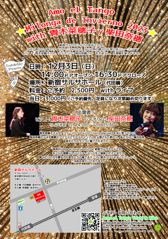 gallery R7 Kimono Milonga with Roberto Sugiura 2025_1_13/池田あきこ先生 ライブドローイングVo:Roberto Sugiura Milonga de Otono Kichijoji 2023_10_9/池田あきこ先生 ライブドローイングVo:Irene Ferrari Cb.:Kenji-Azumaya Milonga de Invierno 2022_12_4/池田あきこ先生 ライブドローイングVn. Vo:会田桃子 Gt.:福井浩気 Milonga ”El Ceibo” with MALA YUNTA TRIO 2022_11_6/池田あきこ先生 ライブドローイングバンドネオン:Koji Hirata ギター:Ariel Lopez Saldivar ピアノ:Emilio Teubal Milonga de Mayo 2022_5_22/池田あきこ先生 ライブドローイング/ピアノ:小林萌里 バイオリン:廣津留すみれ 令和4年 如月 Live Milonga/池田あきこ先生 ライブドローイング/バンドネオン:仁詩 ギター:田中庸介 2022年 新年開幕 Live Milonga/池田あきこ先生 ライブドローイング/ギター:清水悠 アコーディオン:青木まさひろ ♪過去イベントフライヤー♪ 2026.1.12 2025.12.25 2025.11.24 2025.11.16 2025.11.3 2025.10.30 2025.10.13 2025.9.28 2025.8.17 2025.7.31 2025.7.27 2025.6.29 2025.5.18 2025.5.6 2025.4.29 2025.3.23 2025.2.20 2025.2.9 2025.1.13 2024.12.22 2024.12.19 2024.11.4 2024.10.14 2024.9.23 2024.8.11 2024.7.14 2024.6.9 2024.5.3 2024.4.14 2024.3.20 2024.2.23 2024.2.11 2024.1.8 2023.12.24 2023.12.24 program 2023.12.21 2023.12.3 2023.11.3 2023.10.9 2023.9.24 2023.8.27 2023.8.13 2023.7.23 2023.6.25 2023.5.28 2023.5.3 2023.3.19 2023.2.26 2023.1.29 2022.12.4 2022.11.6 2022.10.2 2022.8.28 2022.7.24 2022.6.19 2022.5.22 2022.4.24 2022.3.27 2022.2.27 2022.1.16 2021.12.12 2021.11.3 2021.8.22 共有: X で共有 (新しいウィンドウで開きます) X Facebook で共有 (新しいウィンドウで開きます) Facebook いいね 読み込み中…